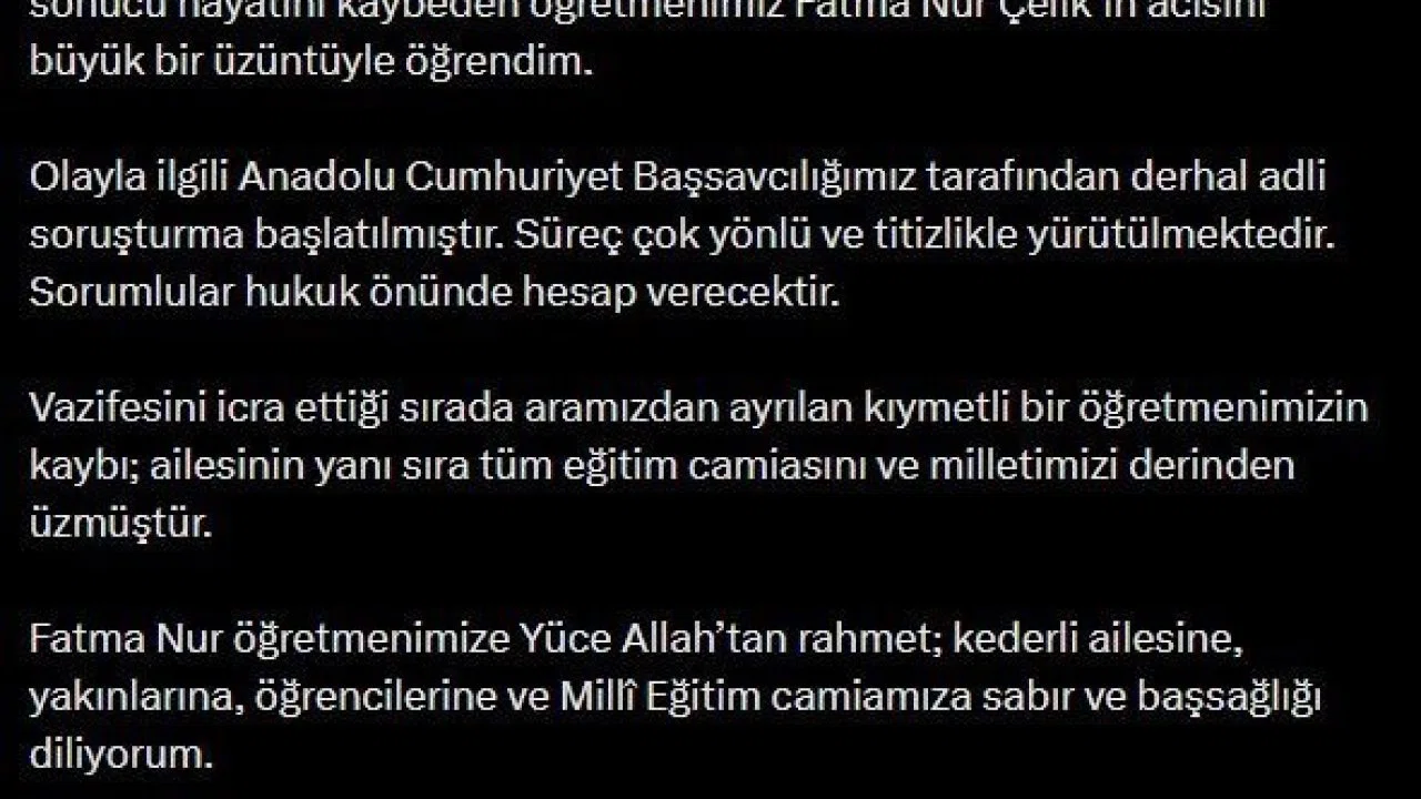 Adalet Bakanı Akın Gürlek, Öğretmen Fatma Nur Çelik’in öldürülmesine ilişkin, "Olayla ilgili Anadolu Cumhuriyet Başsavcılığımız tarafından derhal adli soruşturma başlatılmıştır. Süreç çok yönlü ve titizlikle yürütülmektedir" dedi.