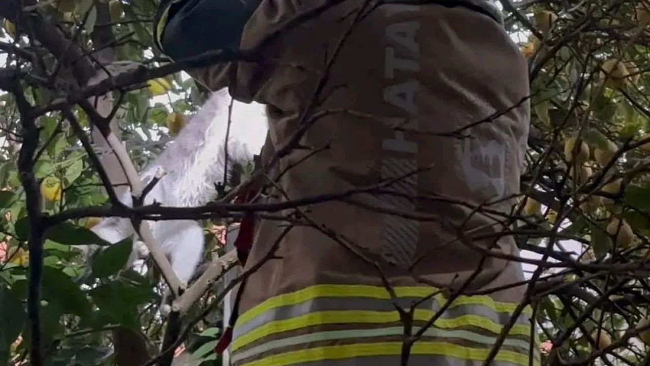 Hatay’ın İskenderun ilçesinde ağacın dallarına ayağı takılan kedi, itfaiye ekiplerince kurtarıldı.