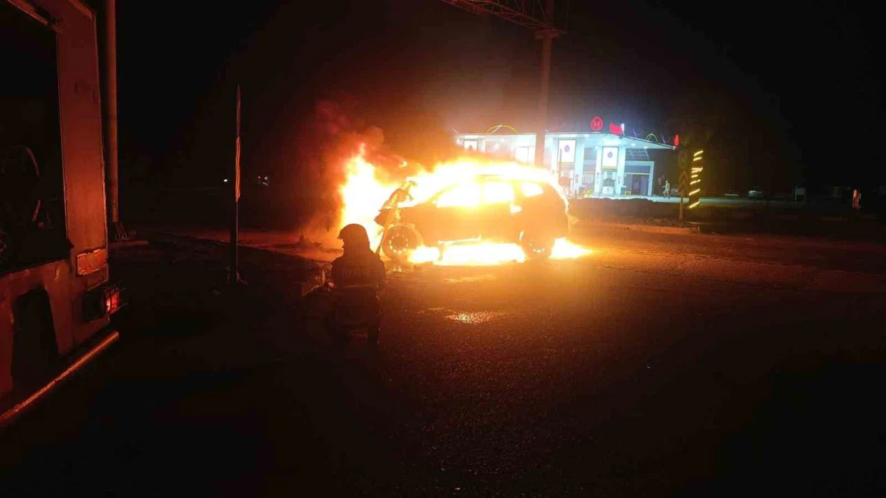 Hatay’da refüje çarparak alev alev yanan araç kullanılmaz hale geldi.