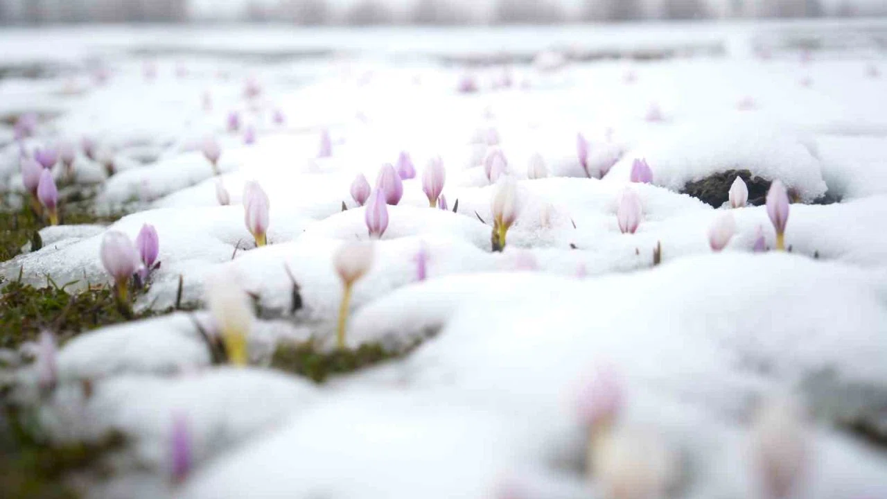 Muş Ovası’nda havaların ısınmasıyla açan çiğdemler, ani bastıran kar yağışının ardından beyaz örtüyle kaplanırken, ortaya güzel manzaralar çıktı.