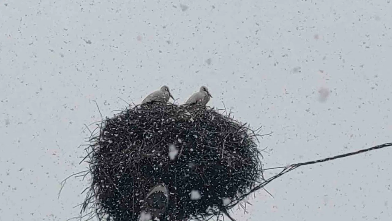 Baharın habercisi olarak bilinen leylekler, Bingöl’e erken gelince kar yağışına yakalandı.