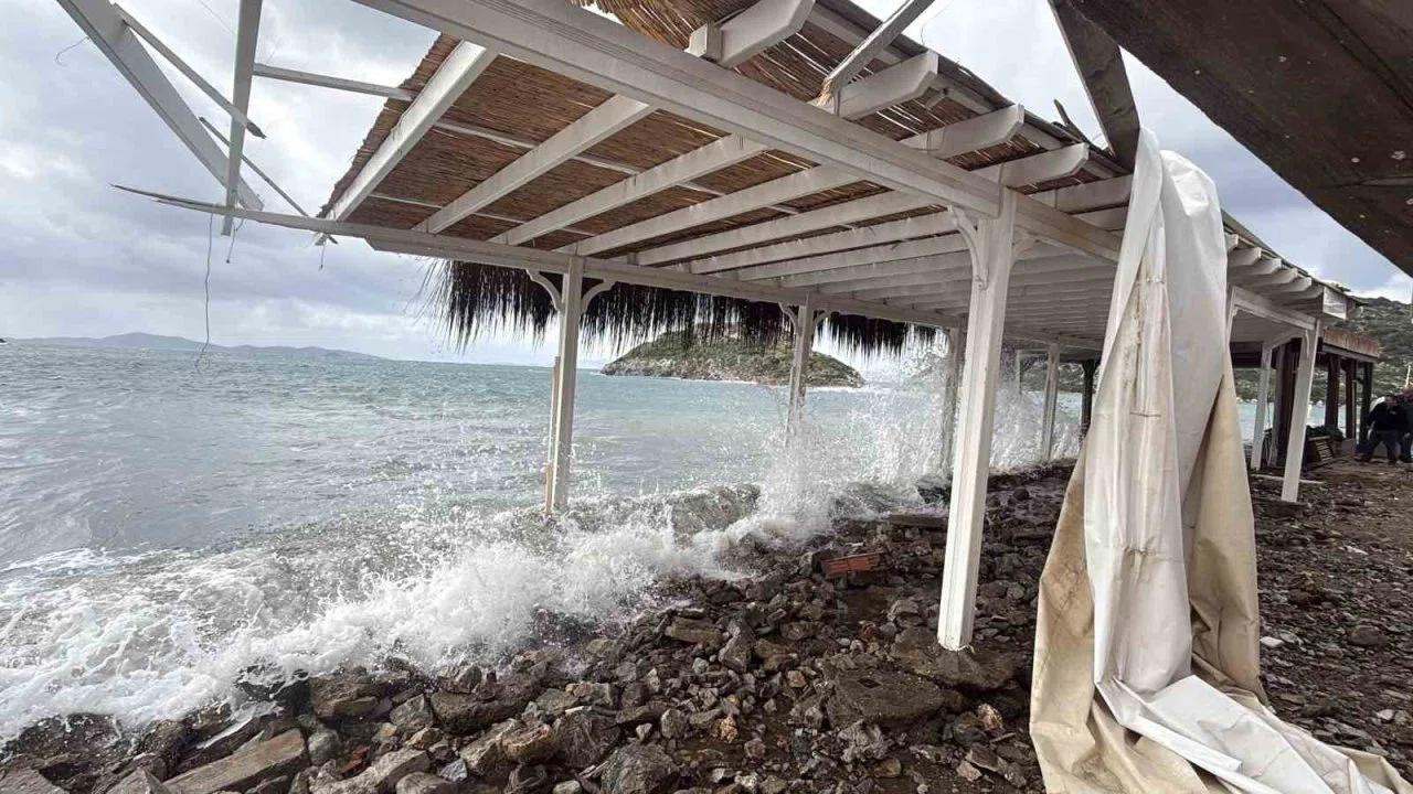Muğla’nın Bodrum ilçesinde gece saatlerinde etkisini artıran fırtına, yarımadanın batı ve kuzey kesimlerinde ağır hasara yol açtı. Yalıkavak Mahallesi’nde yaklaşık 10 metre uzunluğundaki bir reklam panosu devrilirken, Gümüşlük Mahallesi sahil hattındaki işletmeler dev dalgaların ve şiddetli rüzgarın hedefi oldu.