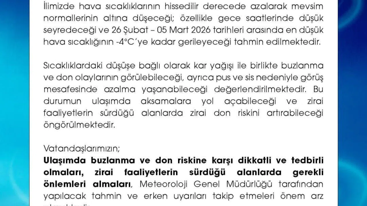 Niğde Valiliği tarafından yapılan açıklamada vatandaşların ulaşımda buzlanma ve don riskine karşı dikkatli ve tedbirli olmaları, çiftçilerin ise zirai faaliyetlerin sürdüğü alanlarda gerekli önlemleri almaları gerektiği vurgulandı, meteorolojik tahmin ve erken uyarıların takip edilmesinin önem taşıdığı belirtildi.