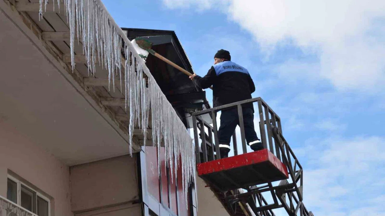 Soğuk hava şartları nedeniyle meydana gelen ve özellikle yayalar için tehlike oluşturan buz sarkıtları, ekiplerin kontrollü müdahalesiyle kırılarak kaldırıldı.