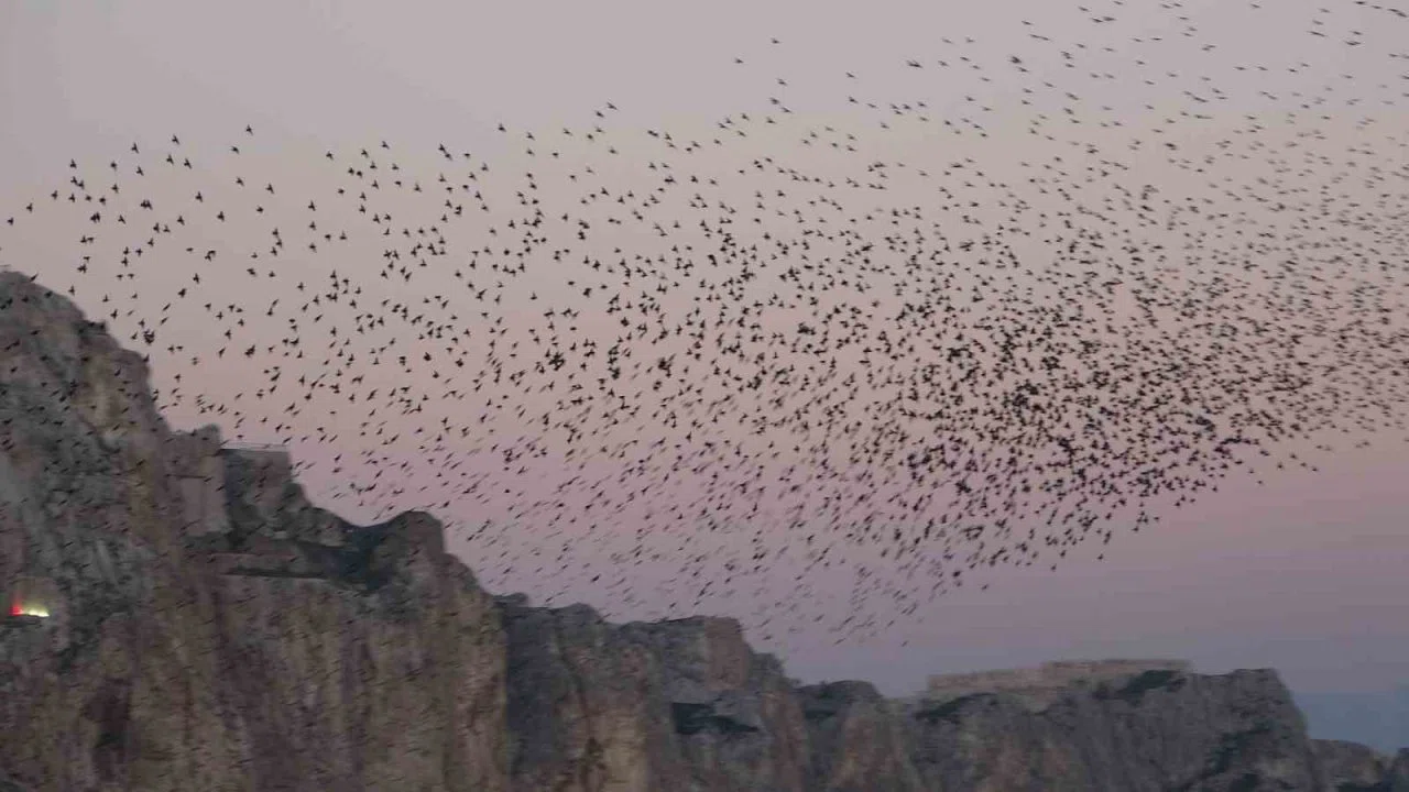 Van’da dün akşam yüzlerce sığırcık kuşu, tarihi Van Kalesi’nin güneyinde eşsiz bir gösteri sundu.