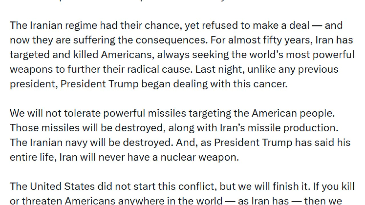 ABD Savunma Bakanı Pete Hegseth, İran’la yaşanan çatışmayı ABD’nin başlatmadığını, ancak ABD’nin bitireceğini belirterek, "Amerikan halkını hedef alan güçlü füzelere müsamaha göstermeyeceğiz. Bu füzeler, İran’ın füze üretim kapasitesi ile birlikte imha edilecek. İran donanması yok edilecek. Başkan Trump’ın tüm hayatı boyunca söylediği gibi, İran asla nükleer silaha sahip olmayacak" açıklamasında bulundu.