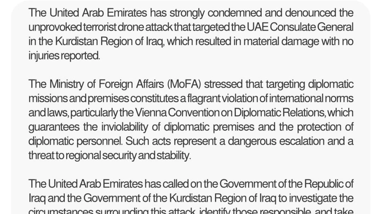 Irak hükümeti ve Kürt Bölgesel Yönetimi’ne saldırıyı soruşturma, faillerin hesap vermesini sağlama ve gerekli tüm önlemleri alma çağrısı yapıldı. BAE’nin güvenlik ve istikrarı baltalamayı amaçlayan bu tür saldırıları kesin bir dille reddettiğini yinelenerek, diplomatik misyonların ve personelin uluslararası hukuk ve normlara uygun şekilde korunması gerektiği vurgulandı.