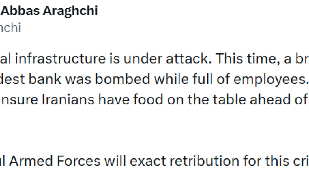 İran Dışişleri Bakanı Abbas Arakçi, bir banka şubesinin çalışanlarla doluyken bombalandığını duyurarak, "Güçlü silahlı kuvvetlerimiz bu suça gerektiği şekilde karşılık verecektir" dedi.