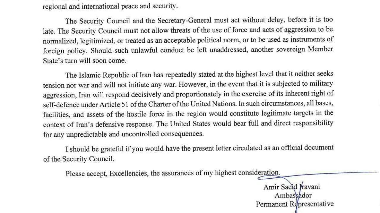 İran’ın gerilim ya da savaş arayışında olmadığını, ancak kendisini savunmaya kararlı olduğunu yineleyen Iravani, "Ülkemiz, askerî saldırıya maruz kalması halinde, BM Şartı’nın 51. maddesi kapsamında sahip olduğu meşru müdafaa hakkını kullanarak kararlı ve orantılı biçimde karşılık verecektir. Böyle bir durumda, düşman kuvvetlere ait bölgedeki tüm üsler, tesisler ve varlıklar İran’ın savunma kapsamındaki meşru hedefleri olacaktır. Doğabilecek öngörülemeyen ve kontrol edilemez sonuçların tüm sorumluluğu doğrudan ABD’ye aittir" ifadelerini kullandı. Irevani, gönderdiği mektubun resmi bir belge olarak BM üyesi devletlere iletilmesi talebinde bulundu.