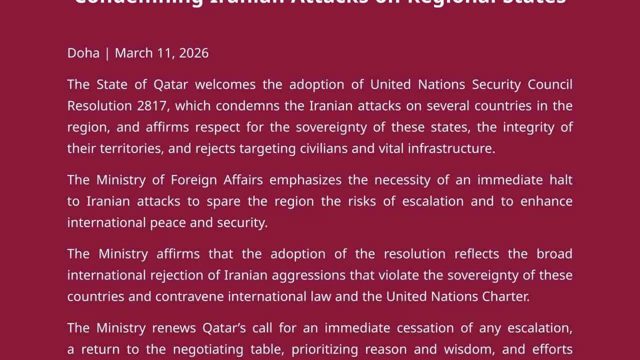 Katar Dışişleri Bakanlığı’ndan yapılan açıklamada, Birleşmiş Milletler Güvenlik Konseyi’nin İran’ın bölge ülkelerine yönelik saldırılarını kınayan bir karar tasarısını kabul etmesinin memnuniyetle karşılandığı belirtilerek, taraflara müzakere masasına geri dönme çağrısında bulunuldu.