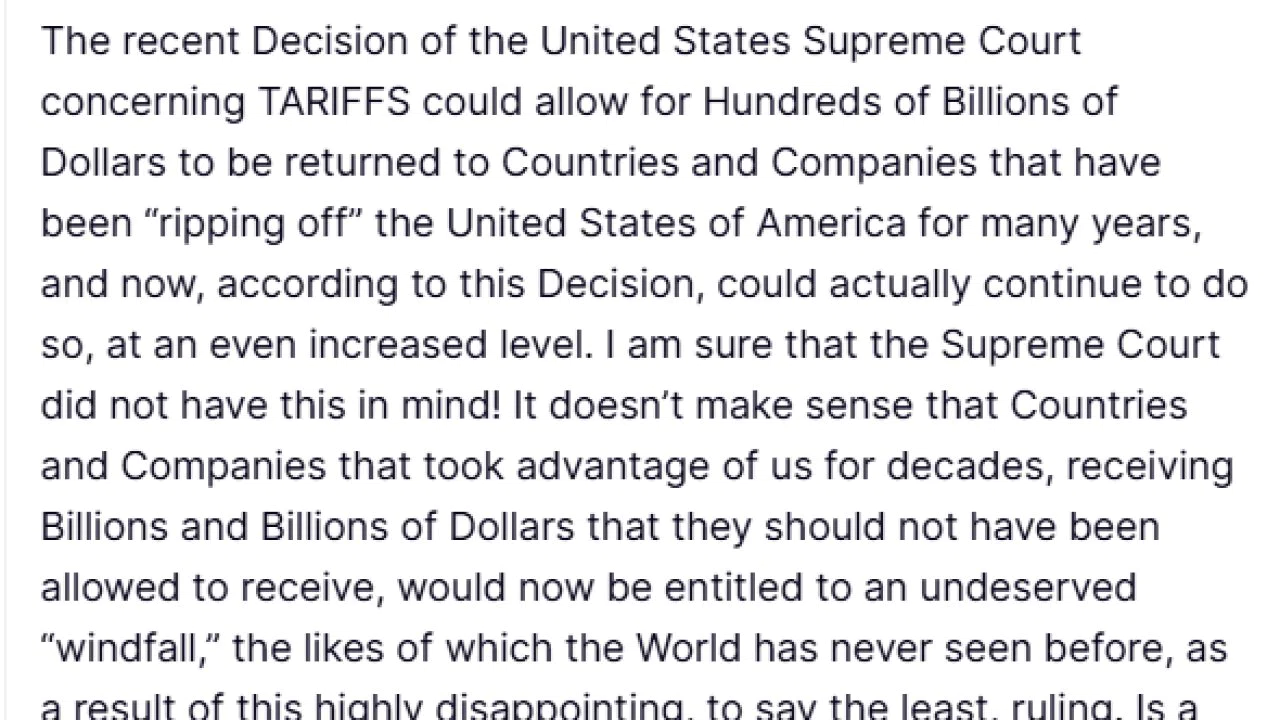 "On yıllarca bizden faydalanan, hak etmedikleri milyarlarca doları alan ülkelerin ve şirketlerin, bu son derece hayal kırıklığı yaratan karar sonucunda, dünyanın daha önce hiç görmediği türden hak edilmemiş bir ‘beklenmedik kazanç’ elde etme hakkına sahip olmaları mantıklı değil" değerlendirmesinde bulundu. Bu nedenle ABD Yüksek Mahkemesi’ni gümrük vergileri ile ilgili kararını gözden geçirmeye çağıran Trump, "Bu davanın yeniden görülmesi veya yeniden karara bağlanması mümkün mü?" diye sordu.