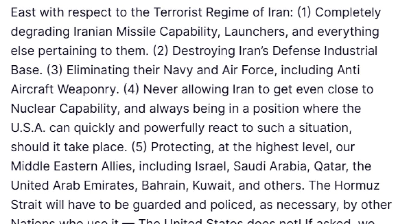 ABD Başkanı Donald Trump, İran’a karşı başlatılan savaşla ilgili sosyal medya hesabından açıklamalarda bulundu. İran’a yönelik askeri operasyonun kademeli olarak sona erebileceğini belirten Trump, "İran’daki rejime karşı Ortadoğu’da sürdürdüğümüz büyük askeri çabalarımızı azaltmayı düşünürken, hedeflerimize çok yaklaştık" ifadelerini kullandı. İran ile ilgili bu hedeflerine açıklık getiren Trump, "İran’ın füze kabiliyetini, fırlatma rampalarını ve bunlarla ilgili her şeyi tamamen etkisiz hale getirmek. İran’ın savunma sanayisini imha etmek. Uçaksavar silahları da dahil olmak üzere İran’ın donanmasını ve hava kuvvetlerini ortadan kaldırmak. İran’ın nükleer silah üretme kapasitesine yaklaşmasına asla izin vermemek ve böyle bir durumun gerçekleşmesi halinde ABD’nin hızlı ve güçlü bir şekilde tepki verebileceği bir konumda olmak. İsrail, Suudi Arabistan, Katar, Birleşik Arap Emirlikleri, Bahreyn, Kuveyt ve diğerleri de dahil olmak üzere Orta Doğu’daki müttefiklerimizi en üst düzeyde korumak" ifadelerini kullandı.