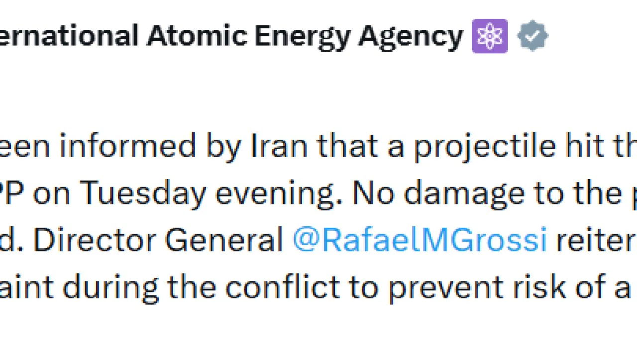 Uluslararası Atom Enerjisi Ajansı, İran yönetiminin Buşehr Nükleer Santrali yerleşkesine salı akşamı füze isabet ettiğini bildirdiğini duyurarak, santralde hasar meydana gelmediğini açıkladı.