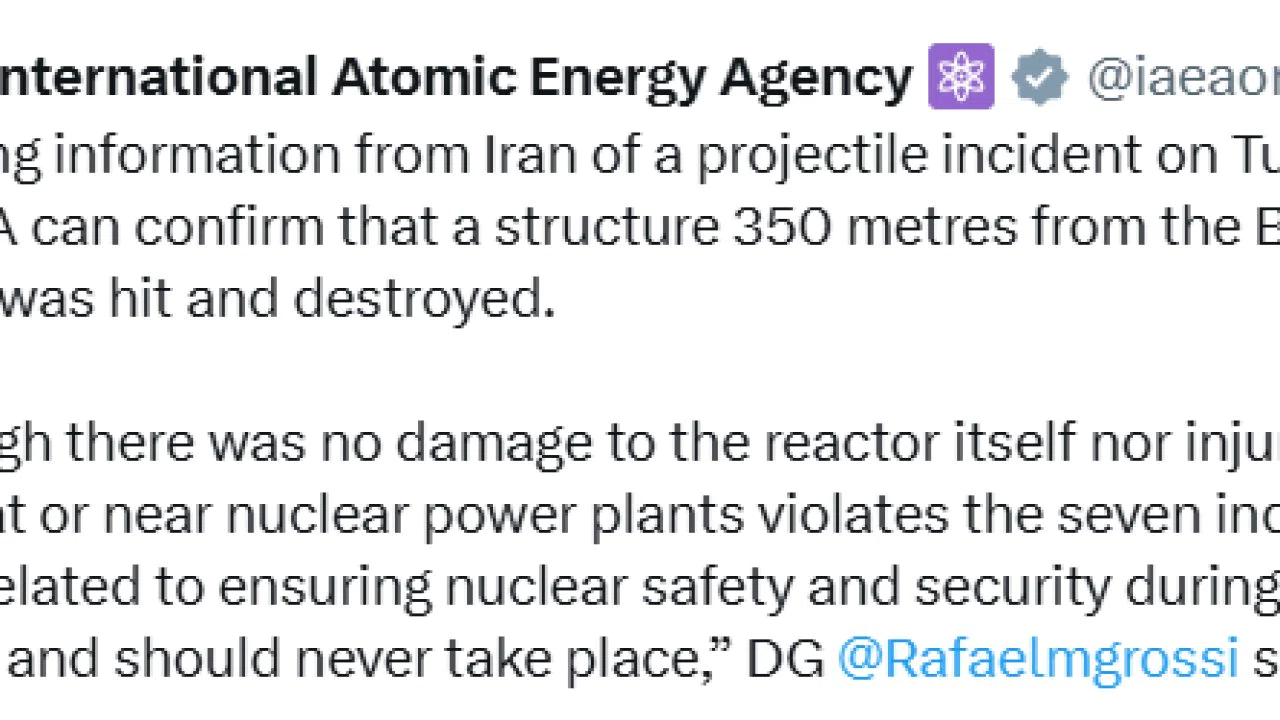 Uluslararası Atom Enerjisi Ajansı (UAEA), İran’daki Buşehr Nükleer Santrali reaktörüne 350 metre uzaklıktaki bir yapının vurularak imha edildiğini doğruladı. UAEA Başkanı Rafael Grossi, muhtemel güvenlik risklerine dikkat çekerek, "Nükleer santrallere veya yakınlarına yapılacak herhangi bir saldırı, silahlı bir çatışma sırasında nükleer güvenlik ve emniyetin sağlanmasıyla ilgili yedi temel ilkeyi ihlal eder ve asla gerçekleşmemelidir" uyarısında bulundu.