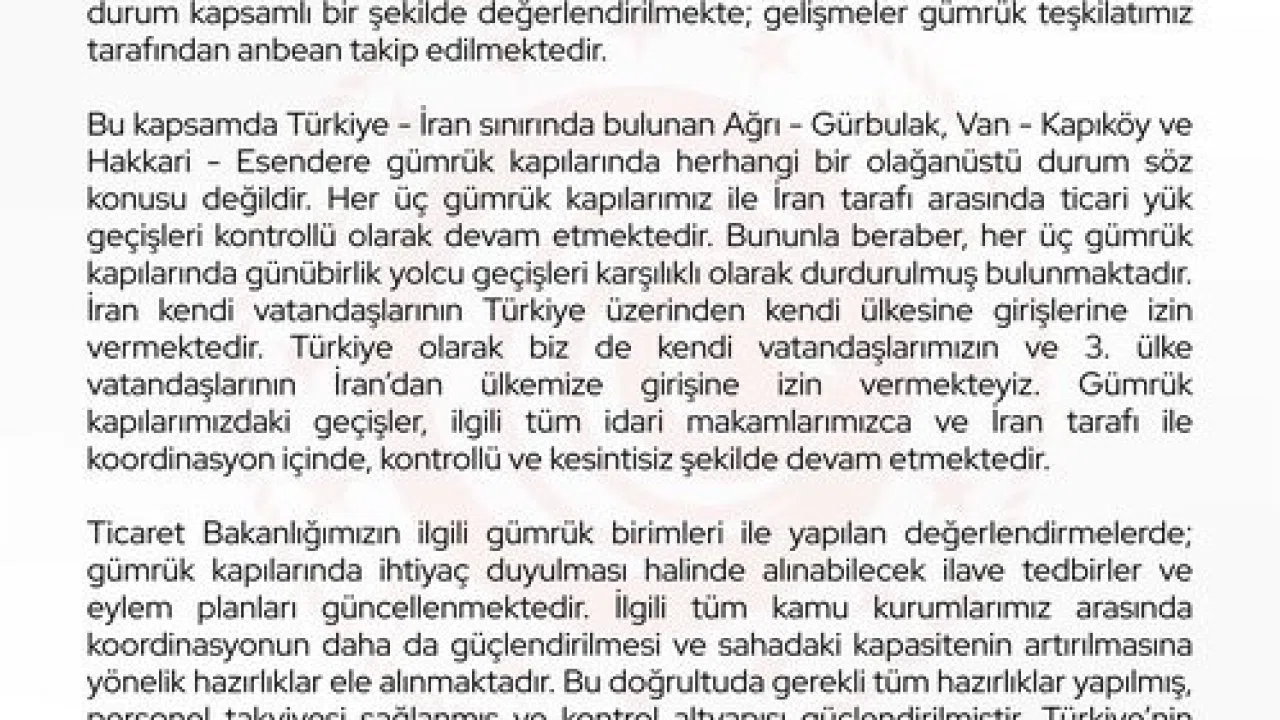 "Ticaret Bakanlığımızın ilgili gümrük birimleri ile yapılan değerlendirmelerde; gümrük kapılarında ihtiyaç duyulması halinde alınabilecek ilave tedbirler ve eylem planları güncellenmektedir. İlgili tüm kamu kurumlarımız arasında koordinasyonun daha da güçlendirilmesi ve sahadaki kapasitenin artırılmasına yönelik hazırlıklar ele alınmaktadır. Bu doğrultuda gerekli tüm hazırlıklar yapılmış, personel takviyesi sağlanmış ve kontrol altyapısı güçlendirilmiştir. Türkiye’nin sınır geçiş hizmetlerinin ve ticaret akışının kesintisiz sürdürülmesi noktasında tüm birimlerimiz teyakkuz halinde görevini sürdürmektedir. Ticaret Bakanlığı olarak, gümrük kapılarımızdaki işleyişi yakından izlemeye; güvenli, düzenli ve hızlı geçişlerin sağlanması amacıyla ilgili tüm kurumlarımızla tam koordinasyon içerisinde gerekli tedbirleri almaya kararlılıkla devam etmekteyiz."