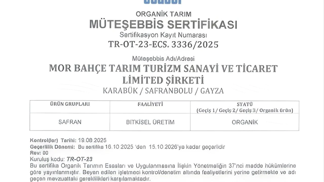 Gelişim sürecinin önemli aşamalarından biri olarak Safranova, Karabük İl Tarım ve Orman Müdürlüğü tarafından yürütülen denetimleri tamamlayarak organik tarım mevzuatı kapsamında organik safran üretimi gerçekleştiren ilk üretici oldu. Alınan sertifika ile üretim süreçleri resmi olarak kayıt altına alınırken kalite ve sürdürülebilirlik standartları kurumsal çerçeveye kavuştu.
