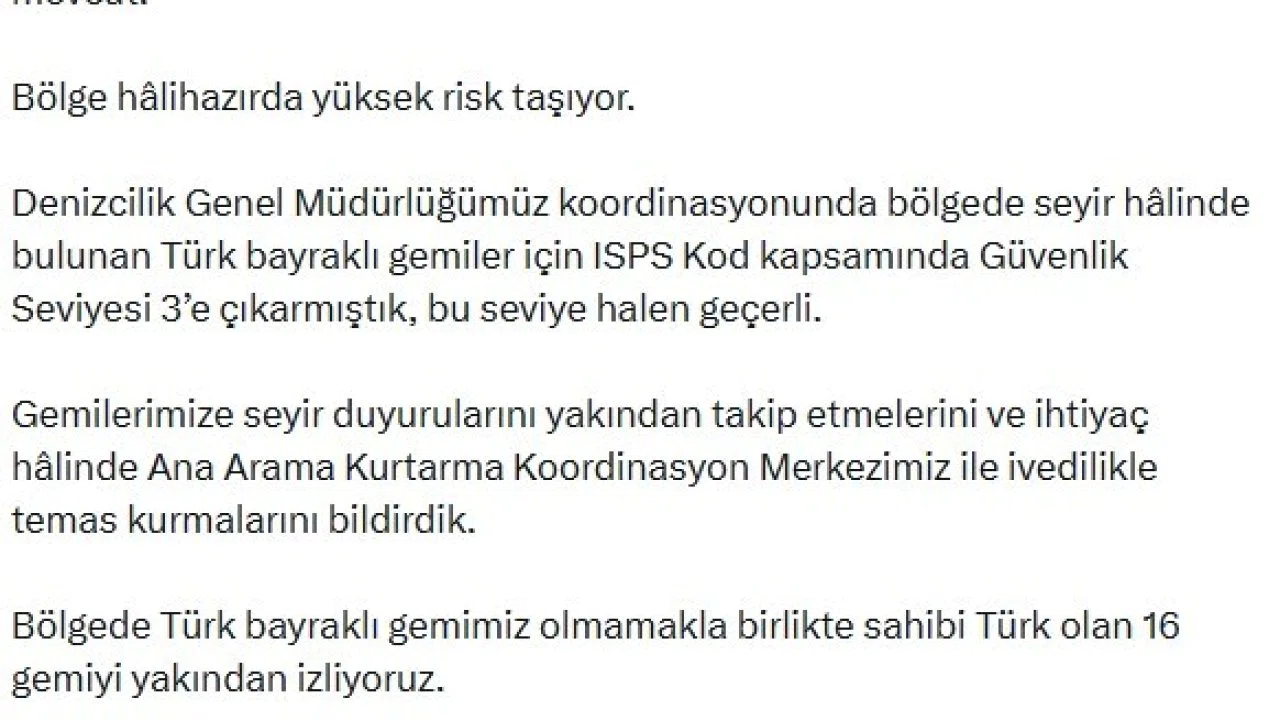 "Hürmüz Boğazı’ndaki ve bölgedeki su yollarındaki gelişmeleri anbean takip ediyoruz. Bilindiği üzere Ortadoğu’da yaşanan savaş nedeniyle 28 Şubat’tan itibaren Hürmüz Boğazı’ndan gemi geçişleri durduruldu. Şu anda Basra Körfezi’nde yüzlerce gemi bekliyor, bazı ticari gemilerde ise hasar bilgileri mevcut. Bölge halihazırda yüksek risk taşıyor. Denizcilik Genel Müdürlüğümüz koordinasyonunda bölgede seyir halinde bulunan Türk bayraklı gemiler için ISPS Kod kapsamında Güvenlik Seviyesi 3’e çıkarmıştık, bu seviye halen geçerli. Gemilerimize seyir duyurularını yakından takip etmelerini ve ihtiyaç halinde Ana Arama Kurtarma Koordinasyon Merkezimiz ile ivedilikle temas kurmalarını bildirdik. Bölgede Türk bayraklı gemimiz olmamakla birlikte sahibi Türk olan 16 gemiyi yakından izliyoruz. Tüm bu gelişmeler, uluslararası deniz kurallarının temel ilkelerinden olan seyrüsefer serbestisinin korunmasının hayati önemini bir kez daha ortaya koymaktadır. Denizcilerimizin güvenliği ve ticaret filomuzun korunması için gerekli tüm diplomatik ve idari tedbirleri kararlılıkla almaya devam edeceğiz."