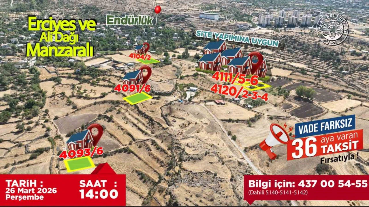 Talas Belediyesi, ilçenin en gözde lokasyonlarında yer alan villa parsellerini satışa sunuyor. Akçakaya ve Endürlük mahallelerinde bulunan toplam 20 adet villa parseli, uygun ödeme şartlarıyla vatandaşların yatırımına açılıyor.