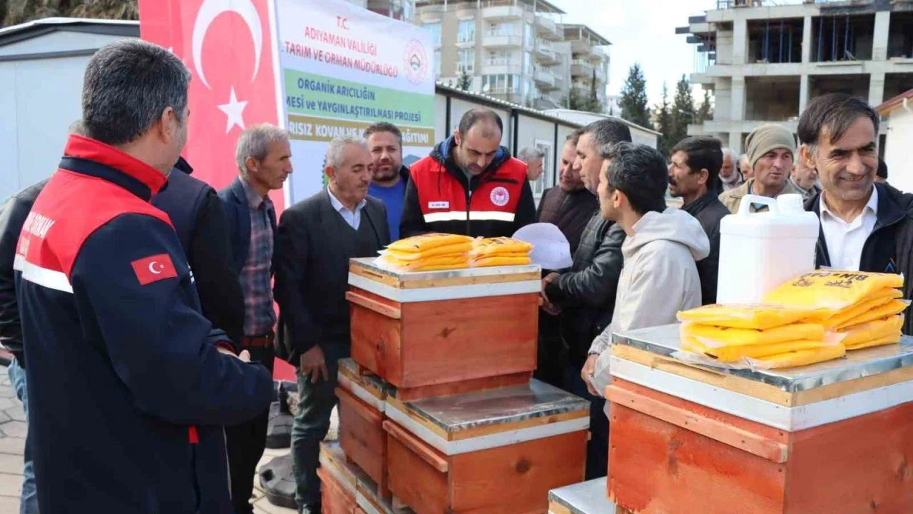 Adıyaman Valisi Osman Varol ve İl Tarım Orman Müdürü Abdulkadir Akkan ile birlikte üreticilere organik arısız kovanların yanı sıra arıcı maskesi, koruyucu pantolon ve eldiven, petek teli yapıştırma makinası, arıcı körüğü ve el demiri dağıtıldı.