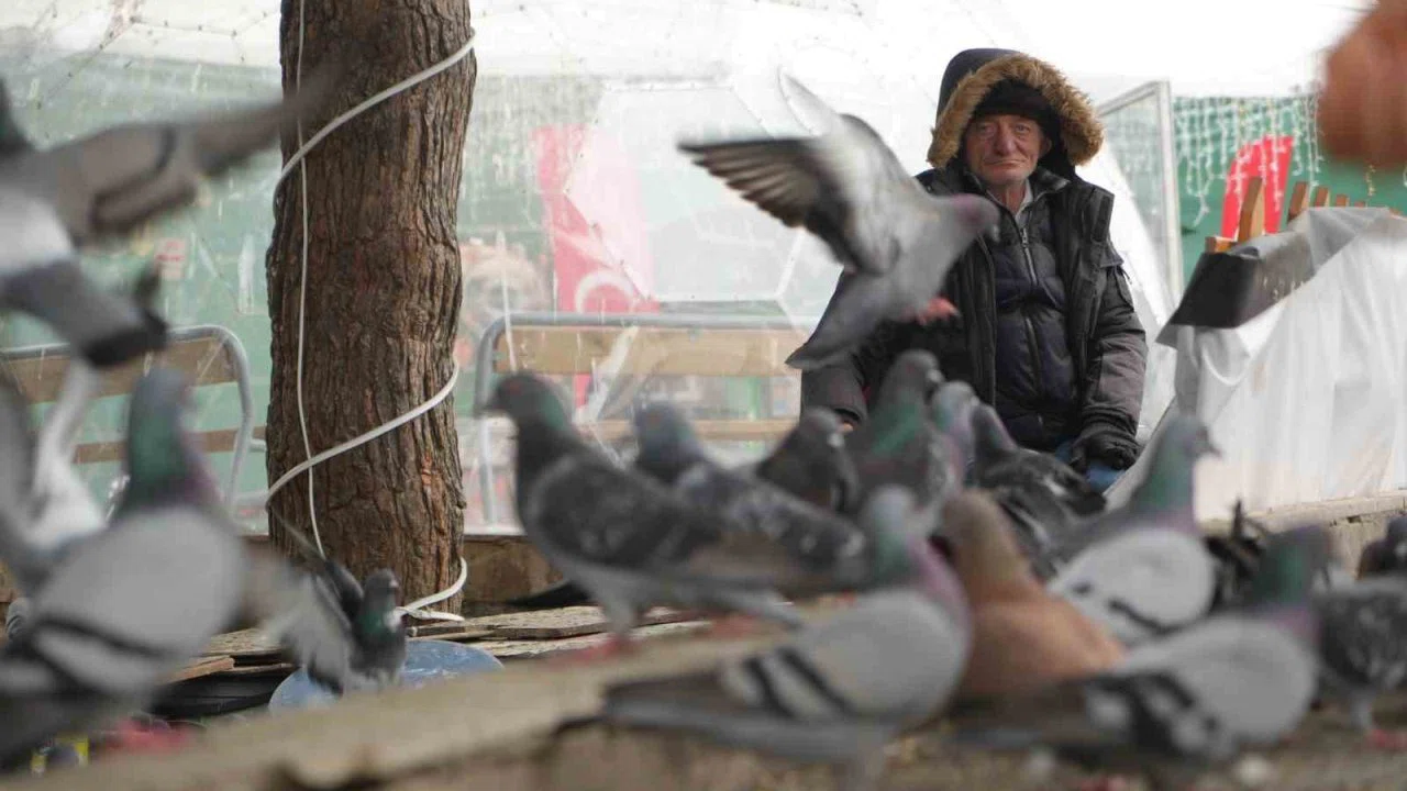 Cumhuriyet Meydanı’nda güvercinlerle birlikte adeta bir bütün haline gelen Kemal Parlak, hem kuşların aç kalmamasını sağlıyor hem de çocukların yüzünü güldürüyor.