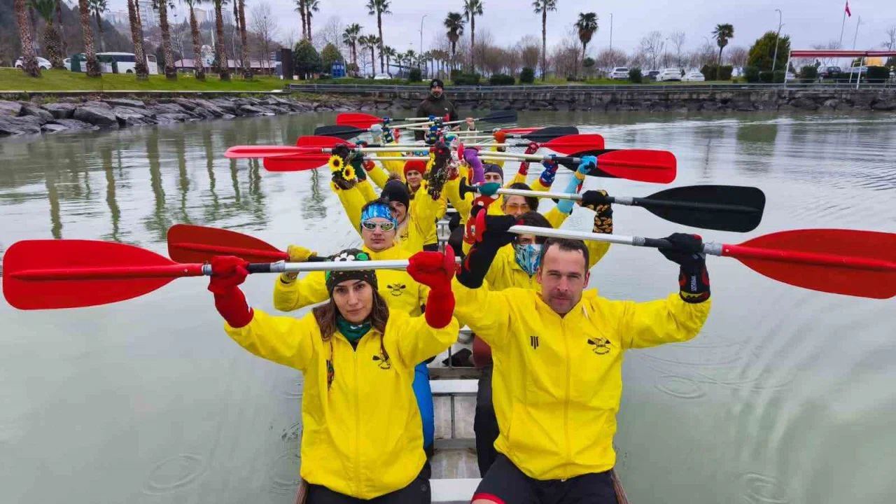 Samsun’da sporcular, Down Sendromu Haftası kapsamında toplumsal farkındalık oluşturmak amacıyla, antrenman sırasında renkli çorapları ellerine geçirerek kürek çektiler.