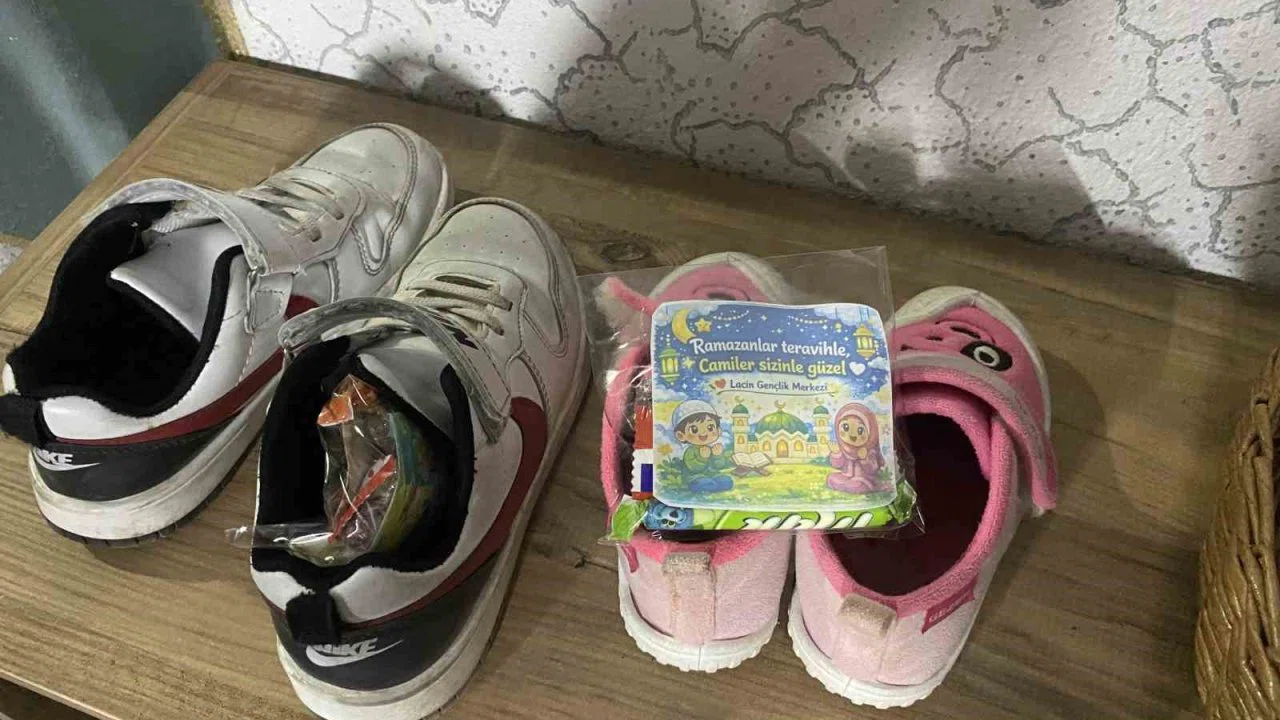 Çorum’un Laçin ilçesinde camiye giden çocuklar, teravih namazı çıkışında ayakkabılarının içine bırakılan sürpriz hediyeleri görünce mutluluk yaşadı.
