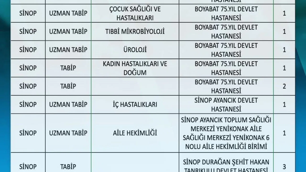 Sinop Atatürk Devlet Hastanesi: 1 kadın hastalıkları ve doğum uzmanı, 1 iç hastalıkları uzmanı. Boyabat 75. Yıl Devlet Hastanesi: Deri ve zührevi hastalıkları, acil tıp, çocuk sağlığı ve hastalıkları, tıbbi mikrobiyoloji, üroloji branşlarında birer uzman hekim; ayrıca 1 kadın hastalıkları ve doğum uzmanı (tabip kadrosu) ve 2 pratisyen tabip. Ayancık Devlet Hastanesi: 1 iç hastalıkları uzmanı.