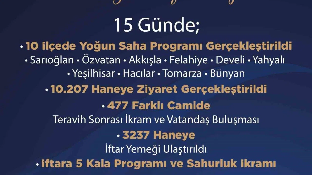 AK Parti Kayseri İl Başkanlığı tarafından çalışmalarla ilgili yapılan açıklamada, "15 günde Sarıoğlan, Özvatan, Akkışla, Felahiye, Develi, Yahyalı, Yeşilhisar, Hacılar, Tomarza ve Bünyan’da gönül gönüleydik. 10 ilçede yoğun saha programı gerçekleştirdik. 10 bin 207 haneye misafir olduk. 477 farklı camide teravih sonrası hemşehrilerimizle buluştuk. 3 bin 237 haneye iftar yemeği ulaştırdık. İftara 5 Kala Programı ve Sahurluk İkramı programlarında Gençlik Kollarımız tarafından 3 bin 150 iftariyelik, iftara yetişemeyen vatandaşlarımıza ulaştırıldı. Ayrıca Tren Garı ve Terminal Binası’nda bin 450 sahurluk dağıtımı gerçekleştirildi. Bu mübarek ayın bereketini, dayanışmasını ve kardeşliğini Kayseri’nin dört bir yanında paylaşmaya devam ediyoruz" ifadelerine yer verildi.