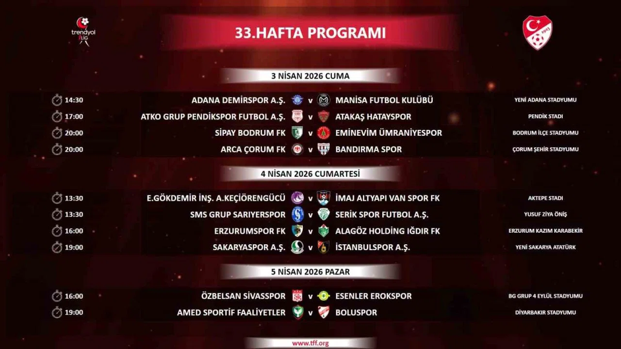 Türkiye Futbol Federasyonu (TFF), Trendyol 1. Lig’in 33, 34 ve 35. hafta programlarını duyurdu. 33. hafta 3 Nisan Cuma,4 Nisan Cumartesi ve 5 Nisan Pazar günleri oynanacak. 34. hafta ise 7 Nisan Salı, 8 Nisan Çarşamba ve 9 Nisan Perşembe günü gerçekleşecek. Açıklanan takvimde 35. hafta, 11 Nisan Cumartesi, 12 Nisan Pazar ve 13 Nisan Pazartesi günü sahne alacak.
