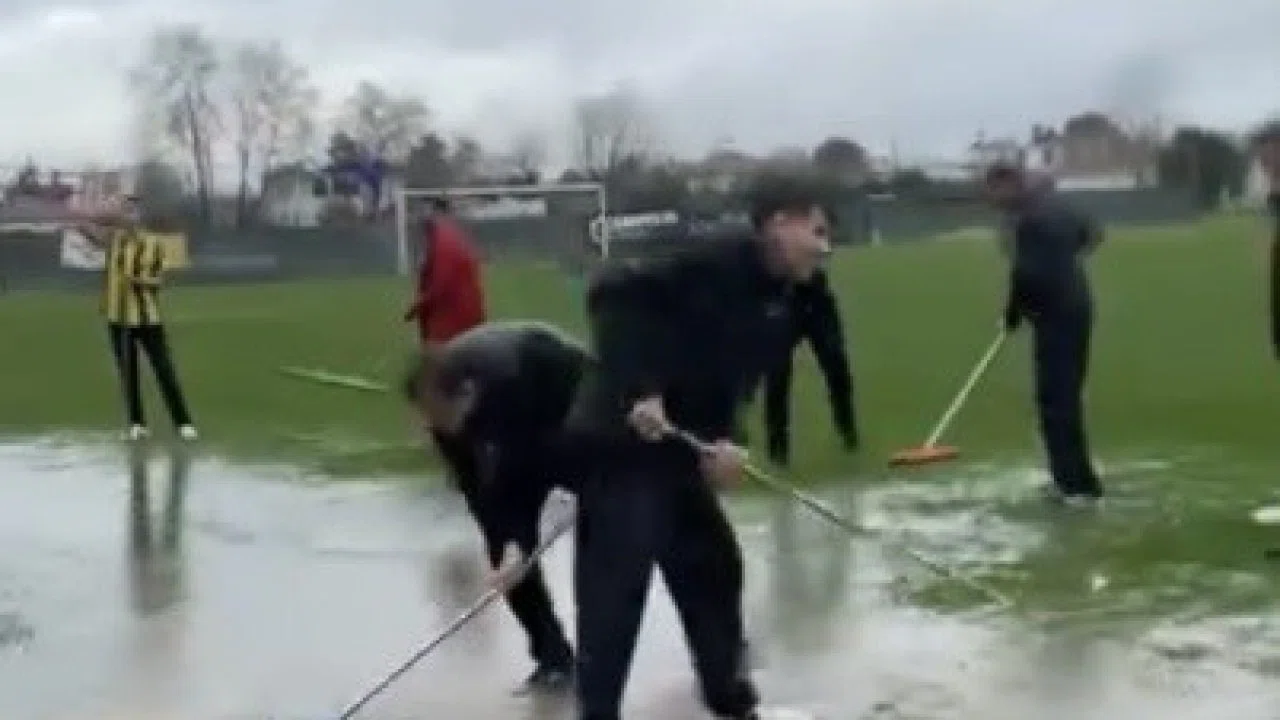 Türkiye Futbol Federasyonu (TFF) 3. Lig 2. Grup’un 25. haftasında oynanan Osmaniyespor FK-Ağrı 1970 Spor karşılaşması öncesinde, yoğun yağış nedeniyle sahada oluşan su birikintilerini taraftar ve görevliler temizledi.